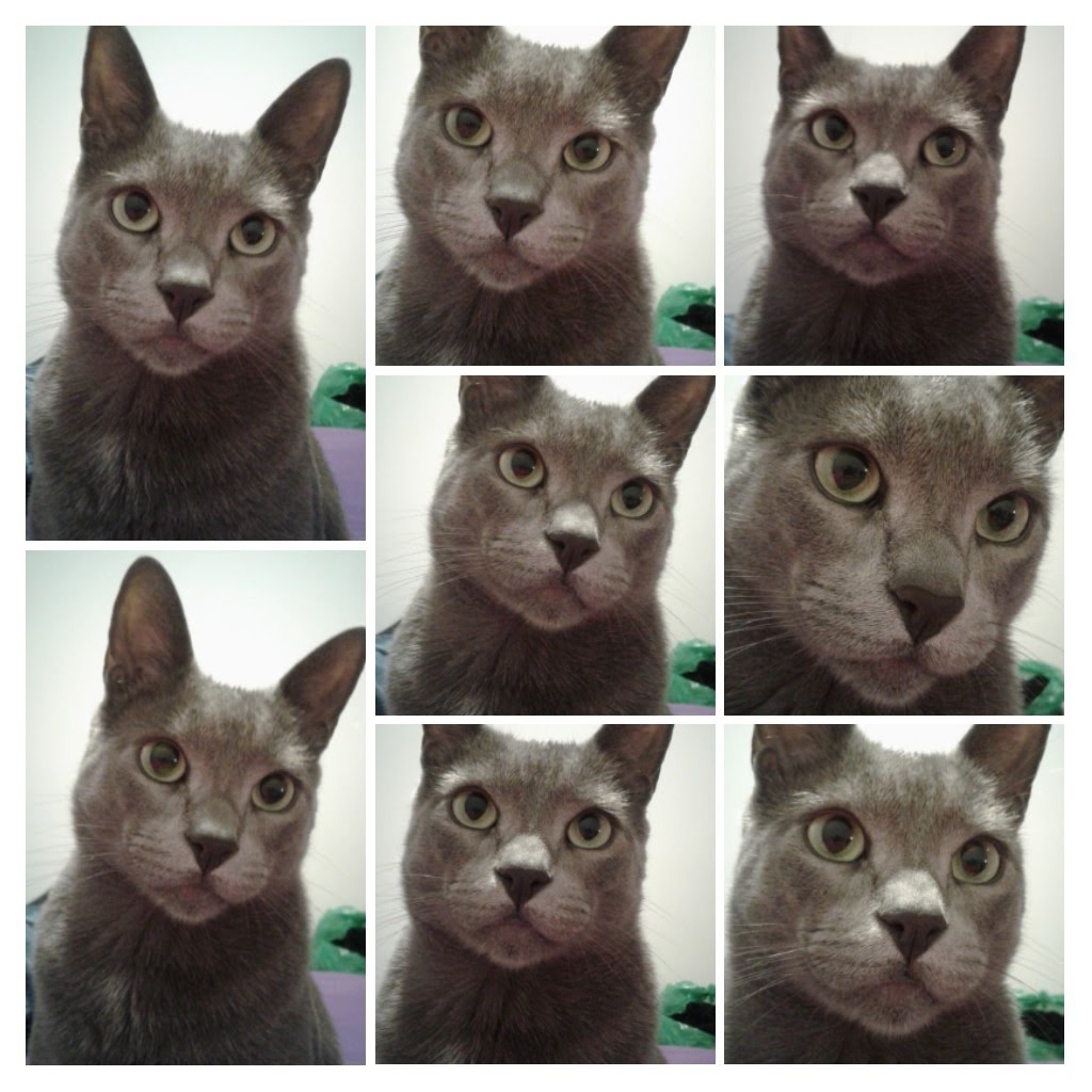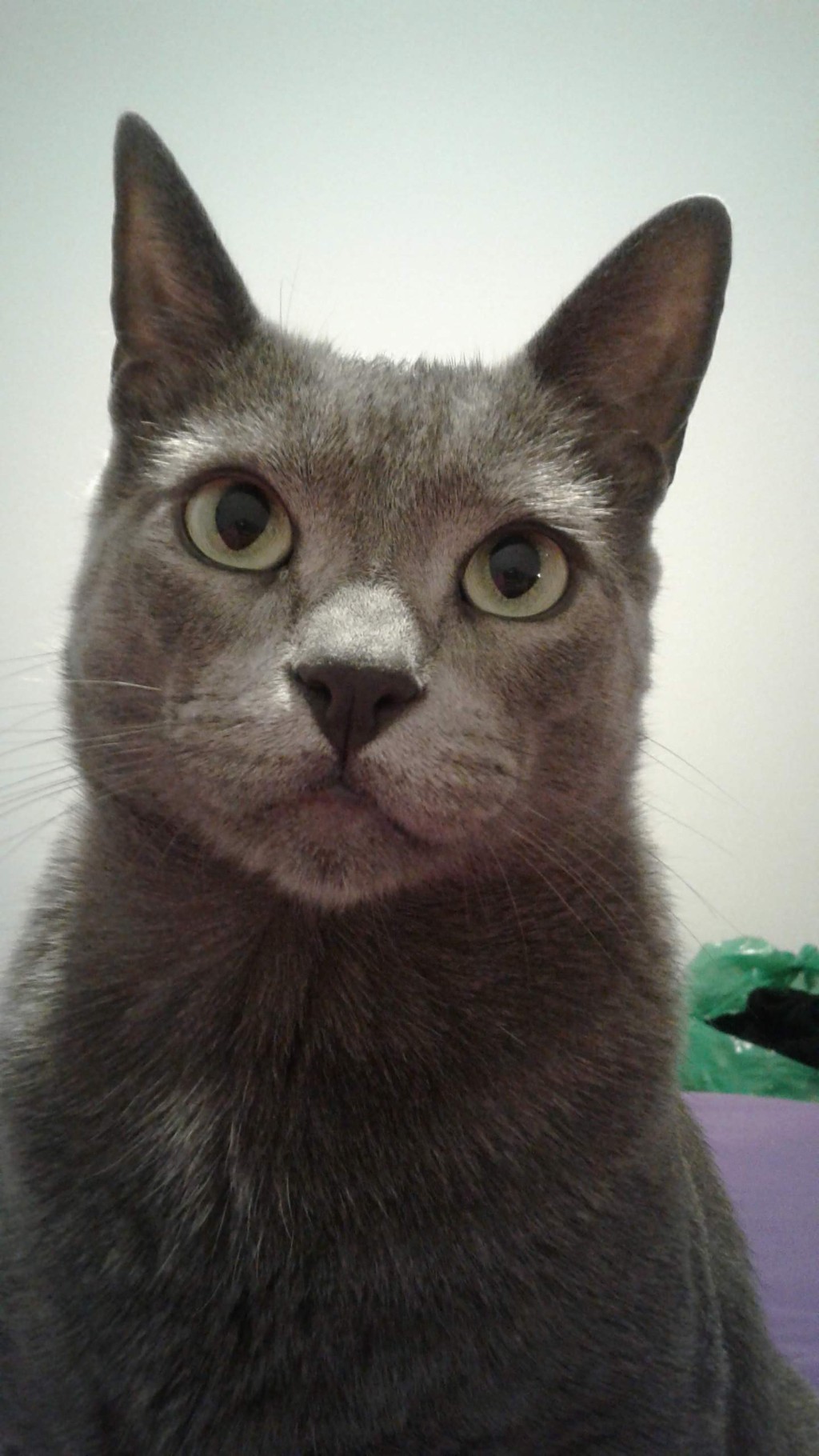 Tengo el pelaje gris, creo que algún ancestro mío fue lo que llaman los humanos “de raza”. Ceci investigó y vió que la raza se llama Azul ruso. Tengo mis ojos verdes amarillentos. Soy suave y estoy gordito. Eso creo que fue consecuencia de que me castraron y que viví la mayor parte de mi vida en departamentos. Si bien ella me hace correr a veces cuando jugamos, corro un rato y me canso enseguida.
